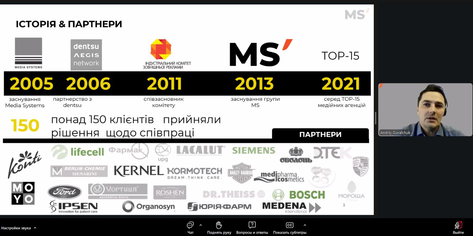Спікером вебінару став Андрій Гуральчук, директор з досліджень та розвитку нового бізнесу компанії Media Systems, практик із понад двадцятирічним досвідом у сфері маркетингу. Під час вебінару учасники ознайомилися з реальним кейсом розроблення медіастратегії, дізналися про сучасні інструменти медіапланування, етапи побудови ефективної стратегії комунікацій і критерії оцінювання її результативності.