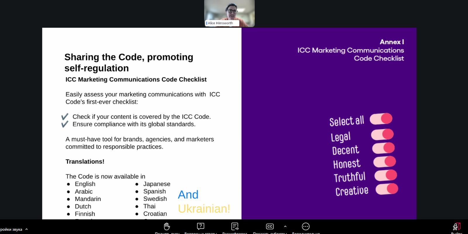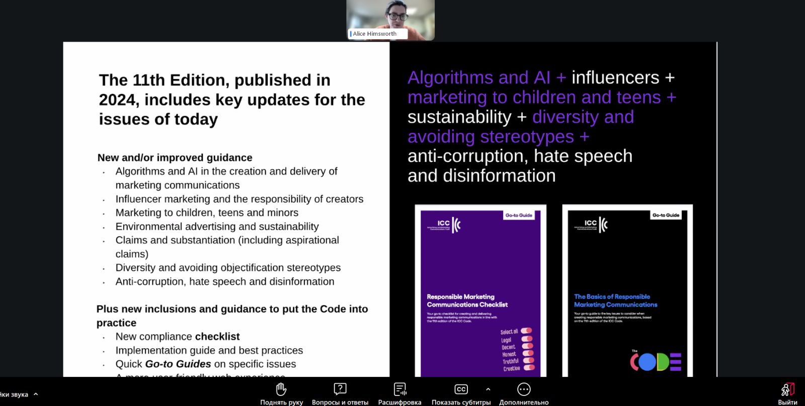 Під час вебінару спікери, серед яких представники Google, ICC Global, УАМ та ICC Ukraine, представили зміст та структуру Кодексу, розкрили його значення для регулювання рекламної діяльності та наголосили на важливих оновленнях 2024 року. Особливу увагу було приділено тому, як нормативні та регулюючі вимоги ICC застосовуються у практичній роботі маркетологів, рекламістів, PR-фахівців, юристів та інших спеціалістів, відповідальних за комунікації і репутацію бренду.